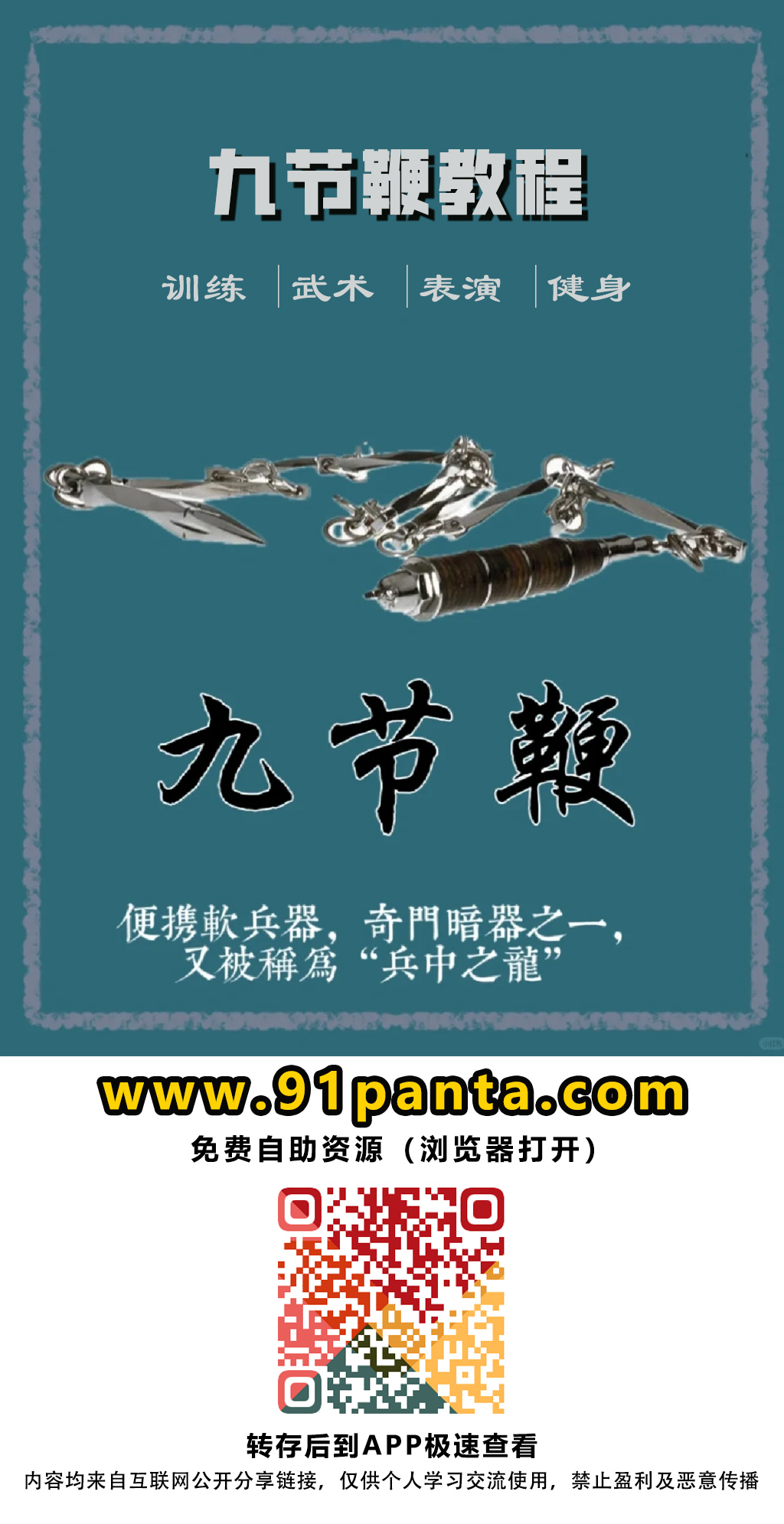 👊中国传统冷兵器之“九节鞭教程”灵活多变,可收可放,多以抡、扫、缠、绕、拨、挂以及各种舞花组成套路!移动云盘